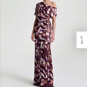 Step out in style with this elegant purple patterned off-shoulder dress. Perfect for any occasion, this dress combines comfort and sophistication. Featuring a bold, hand-painted abstract print on matte satin. The full-length silhouette features a draped asymmetric shoulder and a gathered hip seam for a flattering, fluid shape.