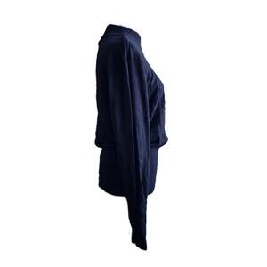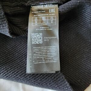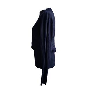 Preowned: Stylish, black cotton blend embossed signature logo knit sweater with mock neckline / long sleeves / tapered cuffs & hemline by Guess.