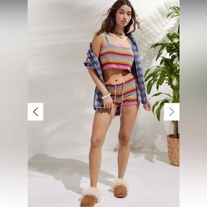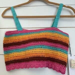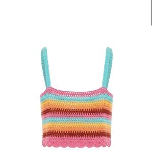 The Siesta Top boasts crochet stripes in vibrant summer hues and a playful scalloped hemline.