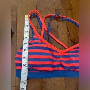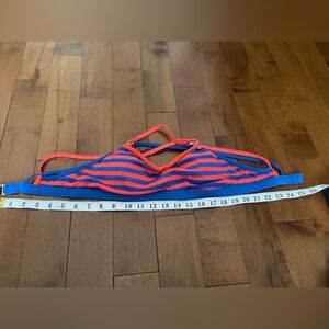 This two-piece features a black high-rise bikini bottom with a flattering, secure fit and a blue and coral striped bikini top with adjustable straps for comfort and support. Finished with the iconic Nike swoosh for a classic athletic look.