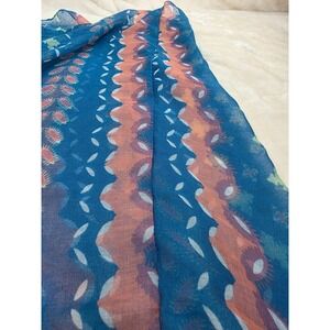 Chatties infinity scarf features a vibrant blue base with a bohemian-inspired geometric and striped pattern in shades of orange, green, and purple. The lightweight, sheer fabric makes it a versatile accessory for layering through multiple seasons. Its continuous loop design allows for easy styling as a single or double wrap.