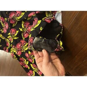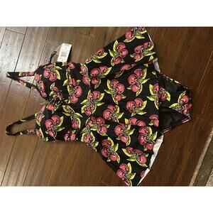 Torrid 4TP Dress Bettie Cherry Peplum Swimsuit Size 0 Large 12. This Torrid swimsuit features a vibrant cherry print on a black background. It has a flattering peplum design that adds a stylish touch. The swimsuit includes adjustable straps and built-in support for comfort. Perfect for summer or poolside wear.