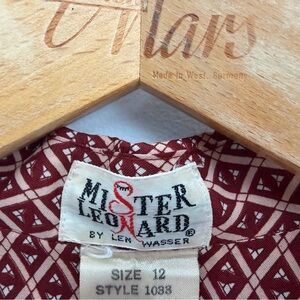 Vintage late 1960s to early 1970s Mr. Leonard blouse featuring a geometric diamond print in red and cream tones. Classic mod era styling with a structured collar and clean retro lines, easy to wear tucked or loose for a timeless vintage look.