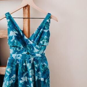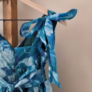 Romantic and dreamy, this Lulus “Flowering Day Dream” midi dress is the ultimate garden party or wedding guest piece. Made with airy woven organza in a teal blue floral print, it features tie shoulder straps, a surplice-style neckline, and a crisscross bodice for a flattering fit. A keyhole cutout at the back waist adds a flirty touch, while the bubble hem midi skirt flows beautifully with movement. Finished with a tying sash bow detail at the back and a hidden back zipper/clasp.