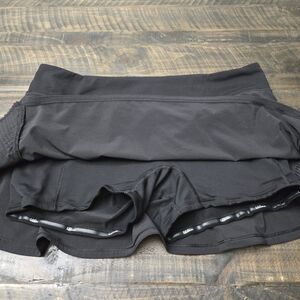 This item is pre-owned. Silky smooth skirt in a classic solid black. Built-in shorts underneath with rubber grips on the inside to keep from riding up. Small zip pocket along the back waistband. There is a small knick in the material on the shorts (see last photo) Otherwise in amazing condition! Please view all photos in the listing and request any additional photos/information you would like
