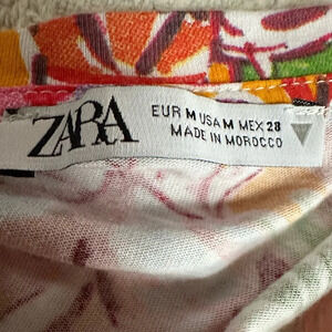 Beautiful vibrant Zara dress featuring an eye-catching tropical print in a stunning orange hue. The round neckline and short sleeves offer a classic silhouette, while the adjustable side cutouts add a touch of allure and allow for a customizable fit