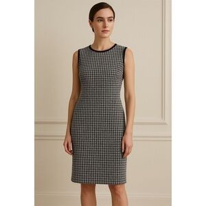 St. John Black and White Houndstooth leather trim shift dress is perfect for fall! This St. John black label dress features a timeless black and white houndstooth pattern, wool blend fabric, sleeveless sheath design with a crew neckline offers a sophisticated and semi form-fitting silhouette. Its midi length adds a modern touch to this classic piece.