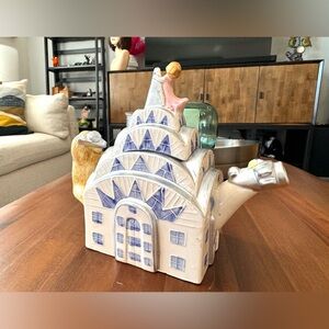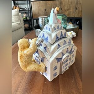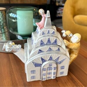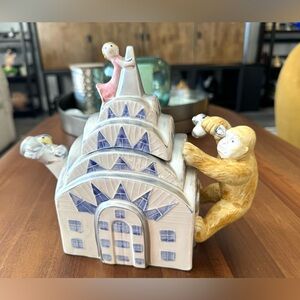 Now this is a find! A vintage 1987 Omnibus ceramic teapot featuring an incredible depiction of King Kong, Fay Wray, and fighter planes atop the Empire State Building in New York City. This highly collectible piece is an artistic rendition of the original *King Kong* movie, making it a must-have for fans and collectors alike.