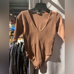 Stylish brown ribbed bodysuit with a deep V-neck. Perfect for layering or wearing alone.