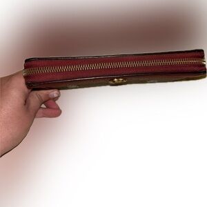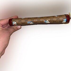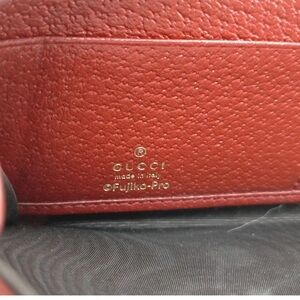 Charming Gucci wallet with playful Doraemon print. Rich brown with vibrant red trim.