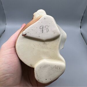 This Vintage Horse & Colt Head Planter from the 1950s is a charming piece of decorative pottery in a brown and off-white color scheme. Made of ceramic, this mid-century modern planter features a glossy finish and portrays a horse subject, making it a unique and original addition to any collection. The American Bisque brand's production technique of pottery and art pottery style add to the appeal of this vintage piece, standing at 6 inches tall and embodying the era of the mid 20th century.
