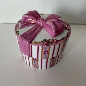Charming ceramic gift box with pink bow and floral accents. Perfect for decor or storage.