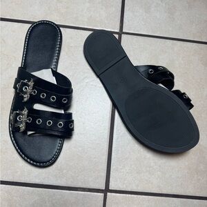 Elegant black sandals with double straps. Features stylish buckle accents. Ideal for casual outings.