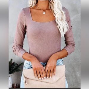VICI Trina Square Neck Ribbed Bodysuit in Mocha Tan Cognac Light Brown Nude