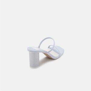 Chic and modern Dolce Vita NOLES block heel sandals in a dreamy light blue leather with a sparkly silver wrapped heel. Minimalist double-strap slide style with a comfortable, sturdy heel — perfect for spring/summer events, weddings, brunch, or vacation looks.