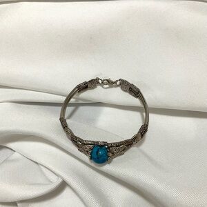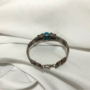This listing is for Novadab Turquoise Silver-plated bracelet with butterflies on the bracelet cuff and a turquoise ball in the center. The butterflied appear to be holding the ball in place. It is a beautiful bracelet It measures a size 6 1/2. It is in like new condition.