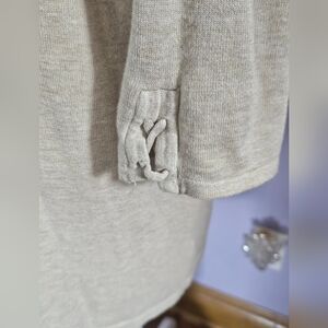 This cream cardigan showcases a long open-front design that drapes elegantly below the waist. Crafted from a lightweight knit fabric, it features 3/4 sleeves and a design down the back of X's for a stylish and comfortable look. It also features a cute matching design at the sleeve. This was a Stitch Fix item and was only wore once.