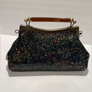 Elegant handbag featuring a vibrant floral pattern with gold accents. Perfect for adding a touch of sophistication to any outfit.