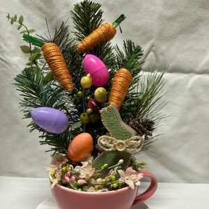 Brighten your home with this festive holiday arrangement featuring an Easter bunny, eggs, greenery & carrots in a pottery cup w matching saucer