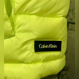 Vibrant neon yellow vest by Calvin Klein. Perfect for layering and adding a pop of color. The neon yellow is a perfect high visibility piece for those who are often outdoors in the dark (running, walking dog, etc.) Size medium. Features a Sherpa collar for warmth and a contrasting knit fabric on the back. In great shape!