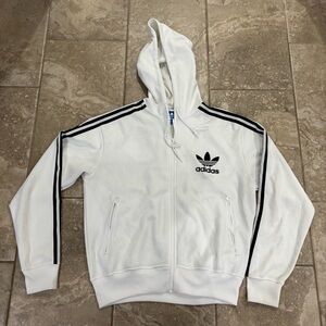 Adidas Originals full-zip hoodie with the iconic Trefoil logo on the chest and the three stripes down the sleeves in white with black accents.
