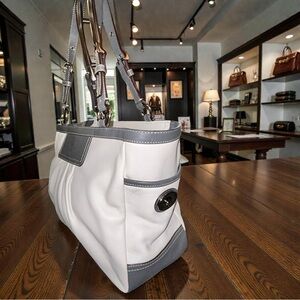 This beautiful Coach shoulder bag will be your perfect fashion companion! Designed to sit comfortably by your side, it makes an elegant statement for everyday wear or special occasions. The timeless ivory and gray colorway gives it a chic, versatile look that pairs beautifully with any outfit.
