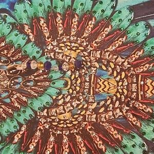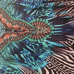 Orange, green, crystal colored Rhinestones embellish the front. Butterfly looking pattern on dress.