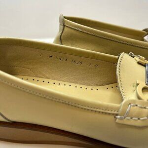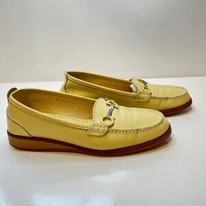 Authentic Salvatore Ferragamo leather loafers in a rare pale yellow / pastel shade — a color you don’t often see and that looks especially good in spring and summer outfits.