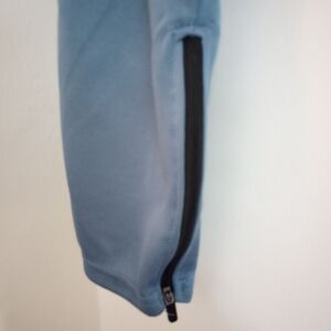 Stylish NBA pants in blue-ish gray. Features logo patch, pockets, zippers, and drawstring stretchy waistband.