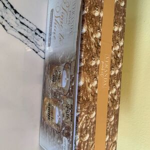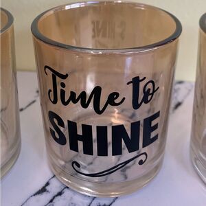 Set of three gold glass candle holders with festive text. Perfect for adding sparkle to any occasion. Candles not included.