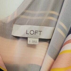 Elevate your wardrobe with this chic LOFT cami, a symphony of soft peach, deep black, cool gray, and sunny yellow stripes. Delicate spaghetti straps lead to a flattering V-neckline, creating a graceful silhouette perfect for layering or wearing solo. The lightweight fabric drapes beautifully, offering effortless style and comfort. Imagine this piece as your go-to for a relaxed brunch, a casual day out, or a stylish evening by the water.