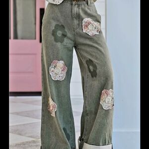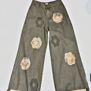 Stylish wide leg pants with floral patches. Unique design for a bold look.