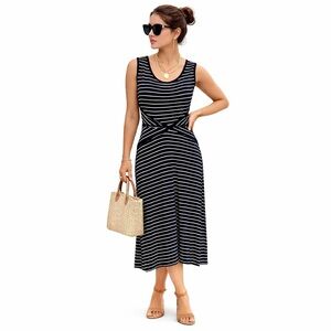 This Max Studio sheath midi dress features a timeless black and white striped pattern, making it a versatile wardrobe staple for weekday or weekend wear. The sleek, sleeveless design and waist detail create a streamlined silhouette while ensuring comfort. The classic stripe pattern adds visual interest, making it suitable for work, travel, brunch, or casual evenings.