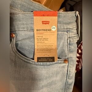 Levi's Boyfriend jeans in soft blue. Mid-rise with relaxed fit. Tapered leg style.