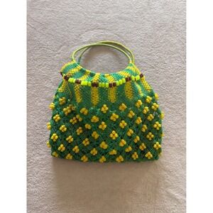 Eye-catching handmade tote bag featuring a unique macrame design. This eye-catching bag showcases a vibrant green and yellow color scheme, adorned with playful yellow beaded accents that create a delightful floral pattern. The upper portion of the bag features a striped pattern with brown and neon green beads, adding a touch of bohemian flair. Perfect for adding a pop of color to your everyday outfits, this tote is ideal for casual outings, beach trips, or farmers market visits.