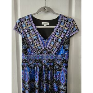 Dress Barn Women's V-Neck Cap Sleeve Ornate Print Dress Blue Purple Size 6
