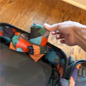 360 wheels with interior compression straps, built-in zipper with laundry bag. Only used a few times and from a pet and smoke free home! Excellent condition!