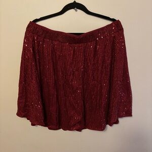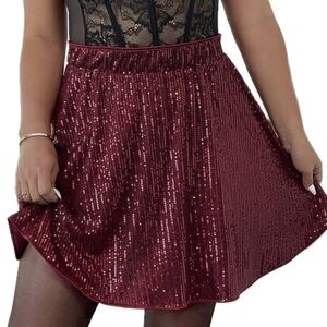 Beautiful and fun sequin a-line mini skirt in a beautiful burgundy. Elastic waist for comfortable fit. Perfect for almost any occasion, but especially fun for a night out on the town, holiday party or New Year’s Eve!