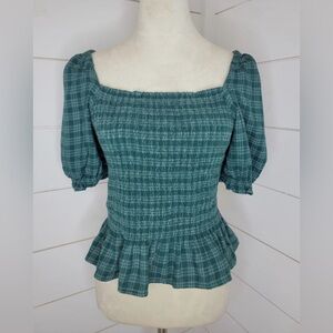 Adorable J.Crew smocked peplum top in a green plaid pattern. Features a square neckline, short puff sleeves, stretchy smocked bodice, and flouncy peplum hem. Size Small, made in India. Perfect for pairing with jeans or skirts for a flattering, feminine look. In great condition!