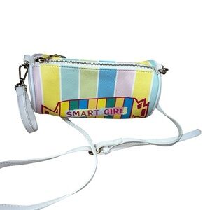 Vibrant crossbody bag with 'Smart Girl' design. Features multicolor stripes and a white strap.