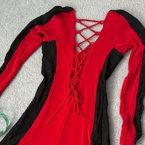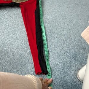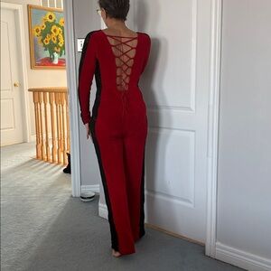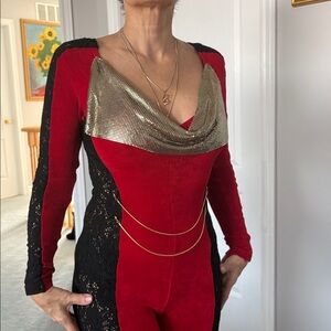 Stylish red and black jumpsuit featuring gold accents. Perfect for a bold look.