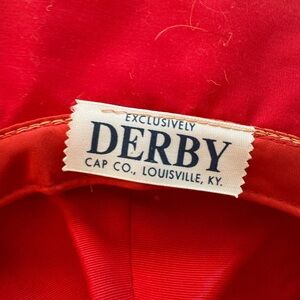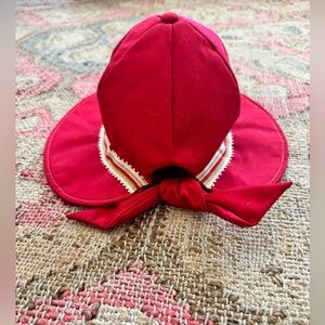 This striking red hat is crafted from a smooth satin-like fabric, featuring elegant white striped ribbon trim. Its structured design with multiple folds adds a touch of sophistication, making it a standout accessory for any occasion - sunny day or Kentucky Derby!