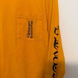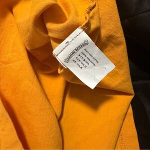 Bold orange tee with black sleeve graphics. Features chest pocket with logo detail, fits true to size