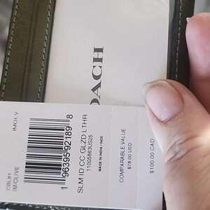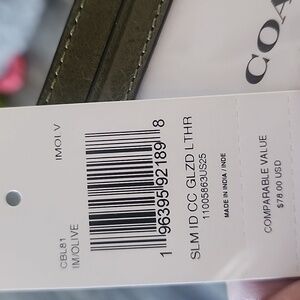 Elegant Coach card holder in dark green leather. Features sleek design for essential organization.