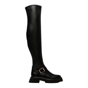 Black leather over the knee boots featuring a chunky lug sole and striking gold buckle detail. These boots are designed with a side zipper for easy wear and a sleek, form-fitting shaft that extends over the knee. Their bold silhouette and practical design make them perfect for adding an edgy flair to everyday outfits or elevating evening looks. Ideal for a stylish urban adventure or a fashionable night out.