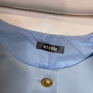 This stylish BTFBM Summer Sleeveless Blazer Vest in sky blue features a round neckline and distinctive gold button-down detailing.