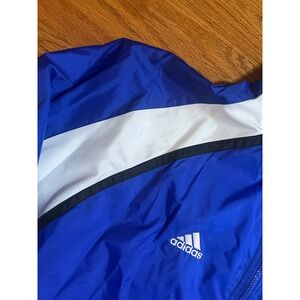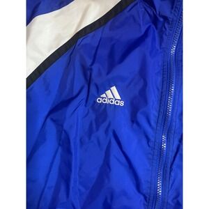 Vintage Adidas Team windbreaker jacket in a vibrant royal blue with white and black colorblock accents. This lightweight jacket features a full-zip front and a breathable mesh lining for comfort during active use or casual wear. The iconic embroidered Adidas logo is prominently displayed on the chest, while the durable nylon shell provides wind resistance. Perfect for a retro athletic look or as a functional layering piece.