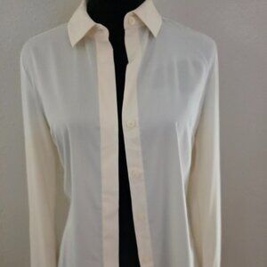 Calvin Klein women's sheer long sleeve button down blouse, size S/P. Beautiful and new with tags, this item is rich cream color. Item is in perfect condition. Made of 97% polyester and 3% spandex. Please see pictures for measurements and condition.