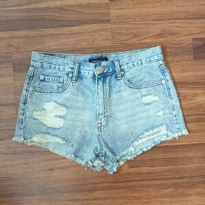 Light wash Aeropostale boyfriend-fit denim shorts with the cutest Y2K patchwork details on the back pocket