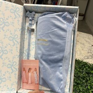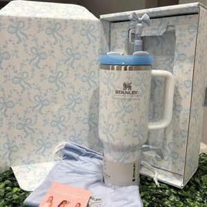 Stanley x Loveshackfancy tumbler with a blue floral design. Features a sturdy handle and straw. Gift box straw and topper including